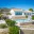 Vista elevada de una villa mediterránea con fachadas blancas, tejados de terracota y terrazas en varios niveles con piscina y muros de piedra natural.