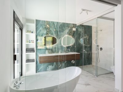 Baño de diseño con pared frontal de ónix verde, bañera exenta blanca y mueble de lavabo doble en madera oscura. Incluye espejos orgánicos retroiluminados y ducha de cristal.