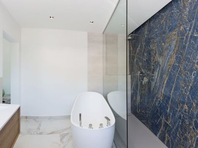 Baño moderno con bañera exenta ovalada, ducha a ras de suelo con pared de mármol azul veteado y suelos de mármol blanco con detalles dorados.