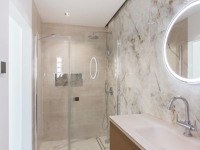Baño moderno con ducha de obra acristalada, revestimiento de mármol veteado, mueble suspendido con lavabo integrado y espejo circular con retroiluminación LED.