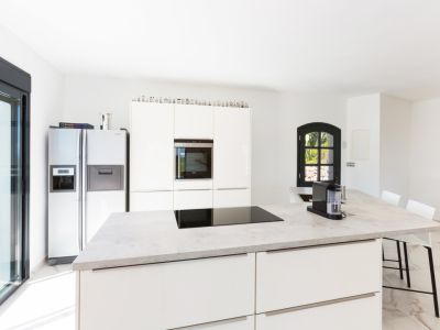 Cocina moderna con isla central de efecto piedra, placa de inducción, armarios blancos y frigorífico americano. Suelo de mármol y acceso directo al exterior.