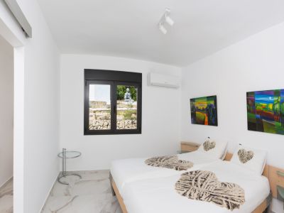Dormitorio con dos camas individuales, suelos porcelánicos efecto mármol y ventana con vistas a un jardín zen. Incluye aire acondicionado y acceso a baño privado.