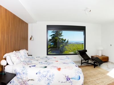 Dormitorio moderno con pared de acento en madera, suelos de mármol y un gran ventanal con vistas panorámicas al mar y al bosque. Incluye una chaise longue de diseño.