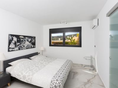 Dormitorio moderno con suelo porcelánico efecto mármol, cuadro monocromático y ventana de marco negro con vistas a una terraza con cactus y montañas.