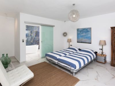 Dormitorio moderno con suelos de mármol, cama con textiles a rayas y puerta corredera de cristal hacia un baño en suite con bañera exenta y pared de piedra azul veteada.