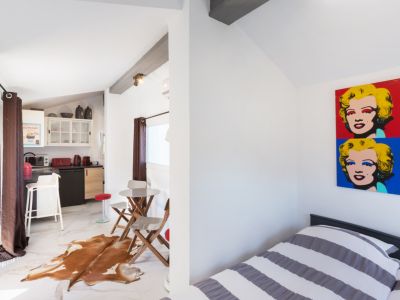 Estudio con decoración pop-art, vigas oscuras y suelo de efecto mármol. Incluye cocina compacta con electrodomésticos rojos y comedor con alfombra de piel natural.