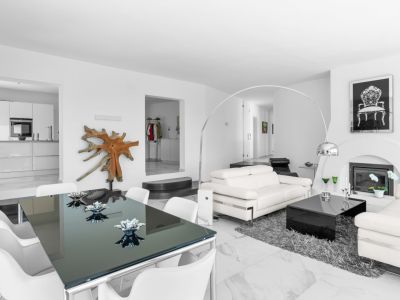 Salón comedor diáfano con suelos de mármol, sofás de cuero blanco, chimenea de diseño y mesa de cristal, con acceso visual a la cocina minimalista.