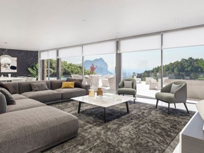 Amplio salón con sofá modular gris, mesa de mármol y ventanales de suelo a techo con vistas panorámicas al Peñón de Ifach y la costa mediterránea.