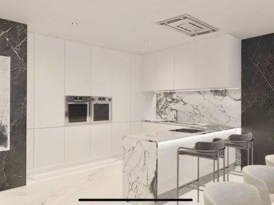 Cocina moderna con armarios blancos minimalistas, isla de mármol veteado, hornos dobles integrados y paneles de pared en mármol oscuro con iluminación técnica.