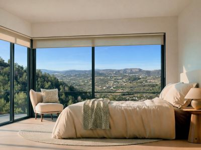 Dormitorio con ventanales de suelo a techo y vistas panorámicas al valle y las montañas. Incluye tonos neutros, mesita de madera y abundante luz natural.