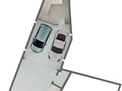 Plano de la planta baja que muestra un garaje doble, un porche cubierto y un vestíbulo con acceso por escaleras a los niveles superiores.