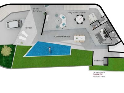 Plano detallado de la planta baja que muestra un salón-comedor abierto, dormitorio principal, terraza cubierta y piscina privada en una parcela de 344m2.