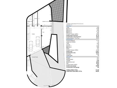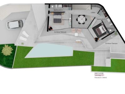 Plano arquitectónico detallado de la primera planta con dos dormitorios en suite, vestíbulo y amplias terrazas cubiertas y exteriores de geometría angular.