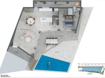 Plano detallado de planta baja con salón-comedor diáfano, suite principal con vestidor y una amplia terraza cubierta con piscina privada de diseño geométrico.