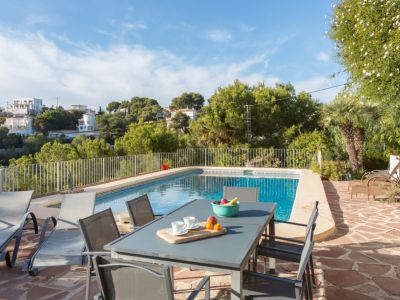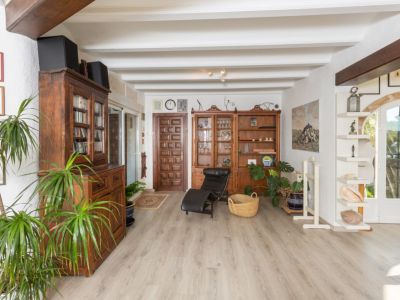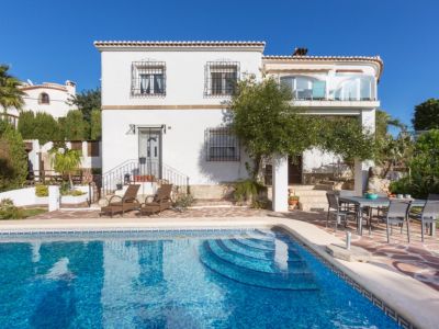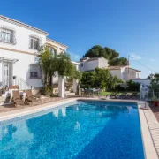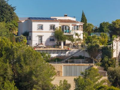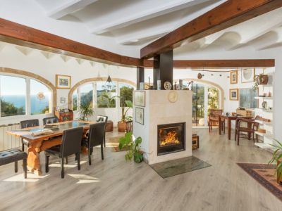 Esta villa de estilo mediterráneo tradicional se encuentra en una posición elevada en Benitachell, ofreciendo vistas panorámicas al mar y a las montañas circundantes. La propiedad destaca por su diseño abierto y luminoso, donde el salón principal cuenta con vigas de madera vista y una chimenea central que divide elegantemente los espacios de estar y comedor. Grandes ventanales de arco permiten que la luz natural inunde el interior mientras enmarcan el paisaje costero.
