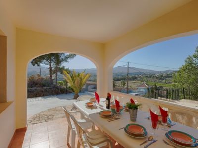 En el exterior, la propiedad dispone de una amplia terraza que rodea una piscina privada rectangular, perfecta para disfrutar del clima soleado de la Costa Blanca. Una naya o porche cubierto ofrece el espacio ideal para comidas al aire libre con vistas panorámicas. Además, la parcela cuenta con una zona de barbacoa de obra, áreas de césped artificial de bajo mantenimiento y espacio de aparcamiento privado dentro del recinto vallado.
