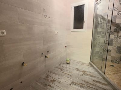 Baño en reforma con suelo cerámico imitación madera, paredes alicatadas en tonos neutros y zona de ducha con mampara de cristal y azulejos hidráulicos decorativos.