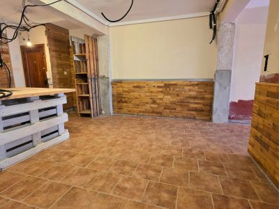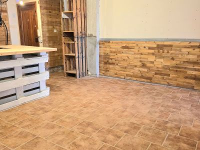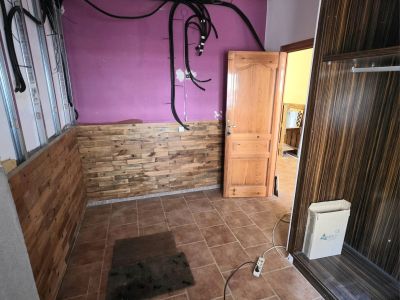 Habitación con suelo de baldosas cerámicas y paredes revestidas con paneles de madera decorativa. La luz natural ilumina el espacio en proceso de reforma.