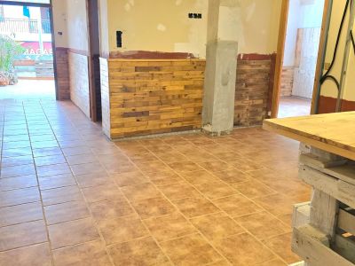 Espacio interior con suelos de gres en tonos tierra, friso de madera rústica y techos con instalaciones vistas, ideal para reforma o local comercial.