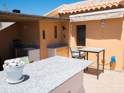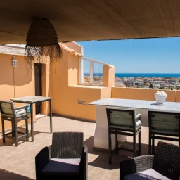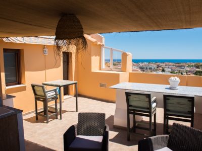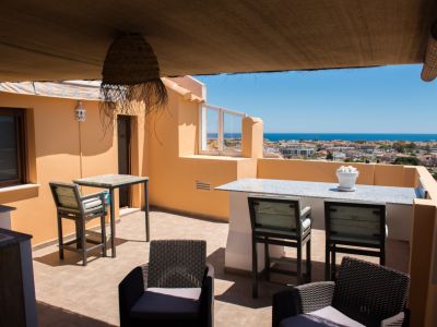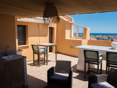 Terraza en la azotea con barra de granito, asientos de mimbre y vistas panorámicas al mar. Incluye zona de sombra, fregadero exterior y suelos cerámicos.