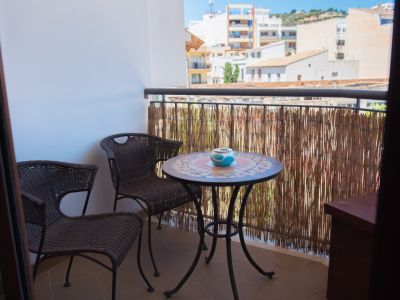 Balcón privado con mesa de mosaico, dos sillas de mimbre y pantalla de cañizo, con vistas despejadas al entorno urbano residencial.
