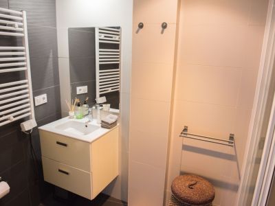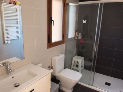 Baño funcional con ducha de obra en tonos oscuros, lavabo blanco con mueble y radiador toallero. Dispone de una ventana con carpintería de madera.