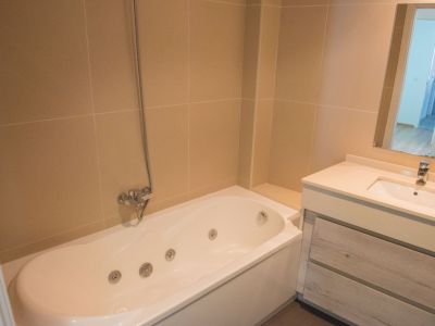 Baño moderno con bañera de hidromasaje, azulejos en tonos beige y mueble de lavabo con cajones de acabado madera y encimera blanca.