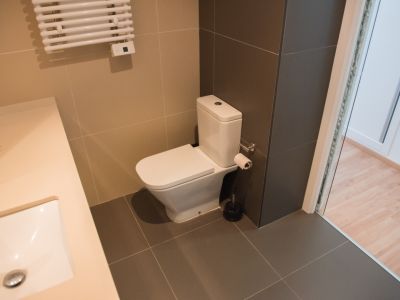 Baño moderno con inodoro de cerámica blanca, suelo de baldosas gris oscuro y radiador toallero. Incluye un lavabo integrado en encimera de tono crema.