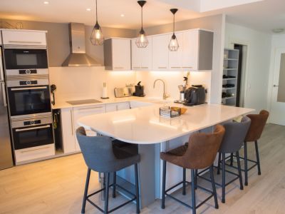 Cocina moderna con isla blanca y taburetes, electrodomésticos Bosch integrados, iluminación colgante industrial y suelos de madera clara.