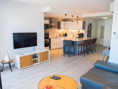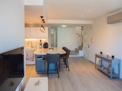 Este moderno dúplex situado en Jávea ofrece una combinación equilibrada de diseño contemporáneo y espacios exteriores funcionales. La propiedad se distribuye en dos niveles, destacando por su luminosidad y una distribución de planta abierta que maximiza el espacio social. En la planta principal, el salón comedor se integra perfectamente con una cocina de estilo minimalista, equipada con electrodomésticos de alta gama y una generosa isla central con barra para desayunos. Desde esta zona se accede a un balcón privado ideal para disfrutar del clima local.