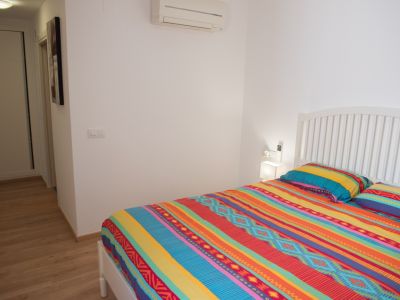 Dormitorio luminoso con cama de estructura blanca, ropa de cama estampada y suelos de madera clara. Incluye aire acondicionado split y paredes blancas.