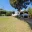 Zona de jardín con césped natural, sendero de piedra y árboles frutales maduros bajo un cielo despejado, rodeada de pinos mediterráneos autóctonos.