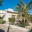 Exterior de una villa mediterránea con entrada de piedra natural, palmeras maduras y jardín de grava de bajo mantenimiento bajo un cielo despejado.