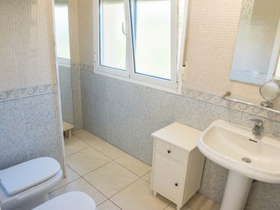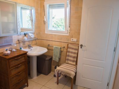 Baño con azulejos beige, lavabo de pedestal y mueble auxiliar de madera. Incluye una ventana oscilobatiente blanca que aporta luz natural.