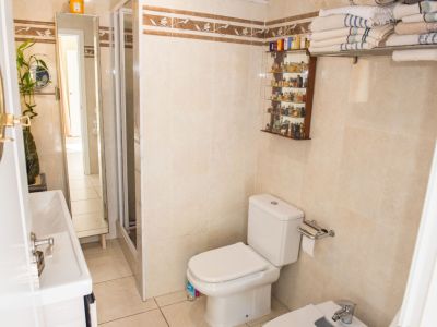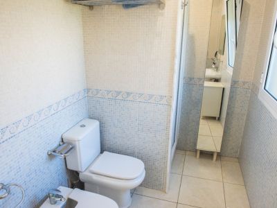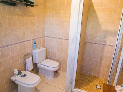 Baño con azulejos en tonos beige, inodoro y bidé de cerámica blanca, y ducha con marco de mármol y mampara de cristal transparente.