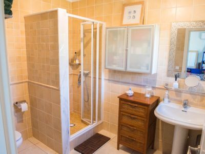 Baño con ducha de obra cerrada en cristal, azulejos en tonos beige, lavabo de pedestal blanco y un mueble auxiliar de madera con frontales trenzados.