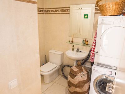 Baño funcional con zona de lavandería integrada, paredes alicatadas en beige, inodoro blanco y torre de lavado con lavadora y secadora apiladas.