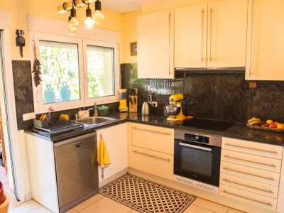 Cocina en L con armarios en tono crema, encimeras de granito oscuro y electrodomésticos integrados. El ventanal ofrece luz natural y vistas al exterior ajardinado.