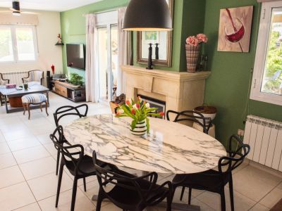 Comedor con mesa de mármol ovalada y sillas de diseño negras, junto a una chimenea de piedra y paredes verdes que conectan con el salón principal.