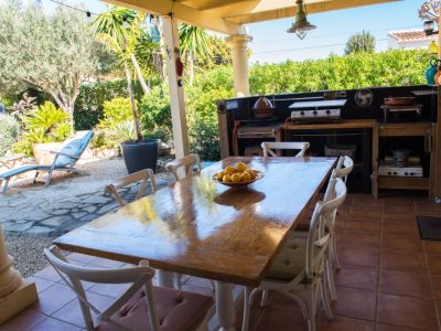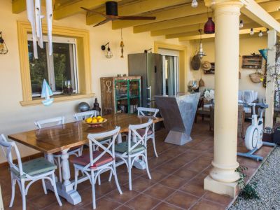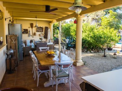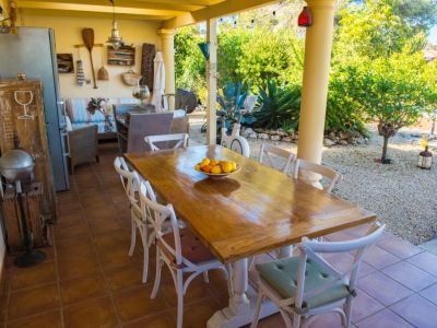 Terraza cubierta con suelo de terracota, mesa de comedor de madera y zona de estar rústica con vistas al jardín mediterráneo y la piscina.
