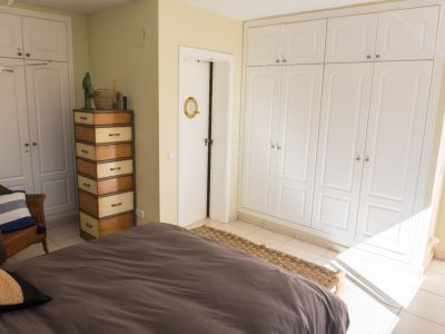 Dormitorio con amplios armarios empotrados blancos, una cómoda de madera bitono y un sillón de mimbre. La luz natural destaca el suelo cerámico y las paredes de tono neutro.
