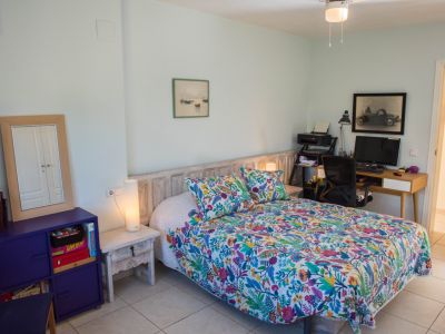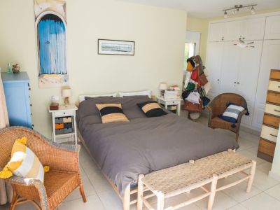 Dormitorio con cama doble, sillones de mimbre y armarios empotrados blancos. Incluye un banco de fibras naturales y suelo de baldosas claras.