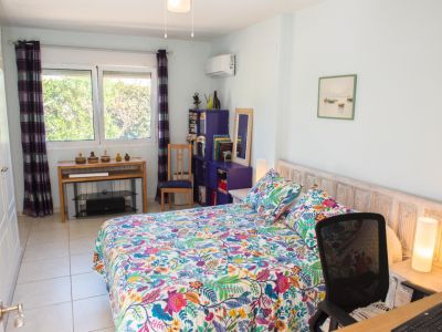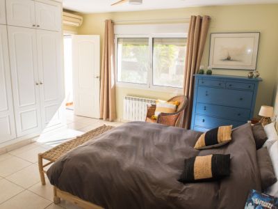 Dormitorio luminoso con armarios empotrados blancos, cómoda de madera azul y suelos de baldosa. Incluye ventanal con vistas al jardín y aire acondicionado tipo split.