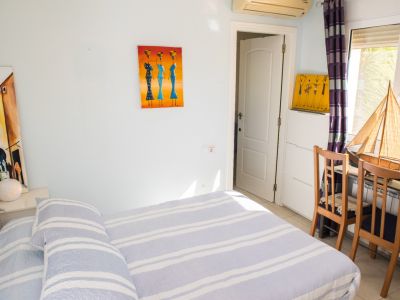 Dormitorio luminoso con ropa de cama de rayas azules, arte decorativo y un rincón de trabajo con sillas de madera y un velero ornamental junto a la ventana.