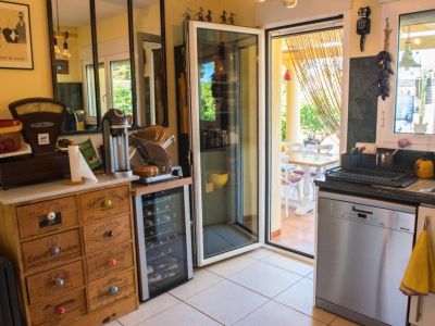 Rincón de cocina con cómoda de madera estilo caja de vino, vinoteca compacta y acceso directo a una terraza exterior amueblada a través de una puerta acristalada.