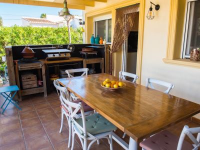 Terraza cubierta con amplia mesa de madera, sillas blancas y cocina exterior equipada con plancha y detalles rústicos sobre suelo de terracota.
