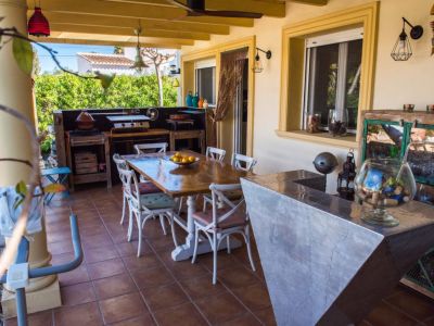 El exterior es el verdadero corazón de la casa, con una gran terraza cubierta que alberga una completa cocina de verano y zona de barbacoa, ideal para disfrutar de cenas al aire libre. El jardín de bajo mantenimiento está decorado con palmeras y plantas autóctonas, rodeando una refrescante piscina privada. La propiedad también cuenta con aire acondicionado, armarios empotrados en los dormitorios y una zona de lavandería integrada. Una oportunidad perfecta para quienes buscan una residencia lista para entrar a vivir en la Costa Blanca.