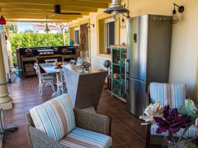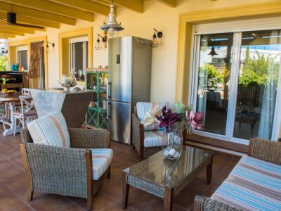 Terraza cubierta con mobiliario de mimbre, cojines de rayas, suelo de terracota y zona de cocina exterior equipada con frigorífico de acero inoxidable.
