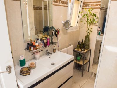 Tocador de baño con lavabo de cerámica blanca, mueble de madera clara y espejo decorado. Incluye estantería auxiliar, luz natural lateral y revestimiento cerámico en tonos crema.