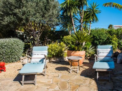 Zona de descanso exterior con tumbonas de madera, cojines azules y jardín mediterráneo con olivos, palmeras y suelo de piedra natural y grava.